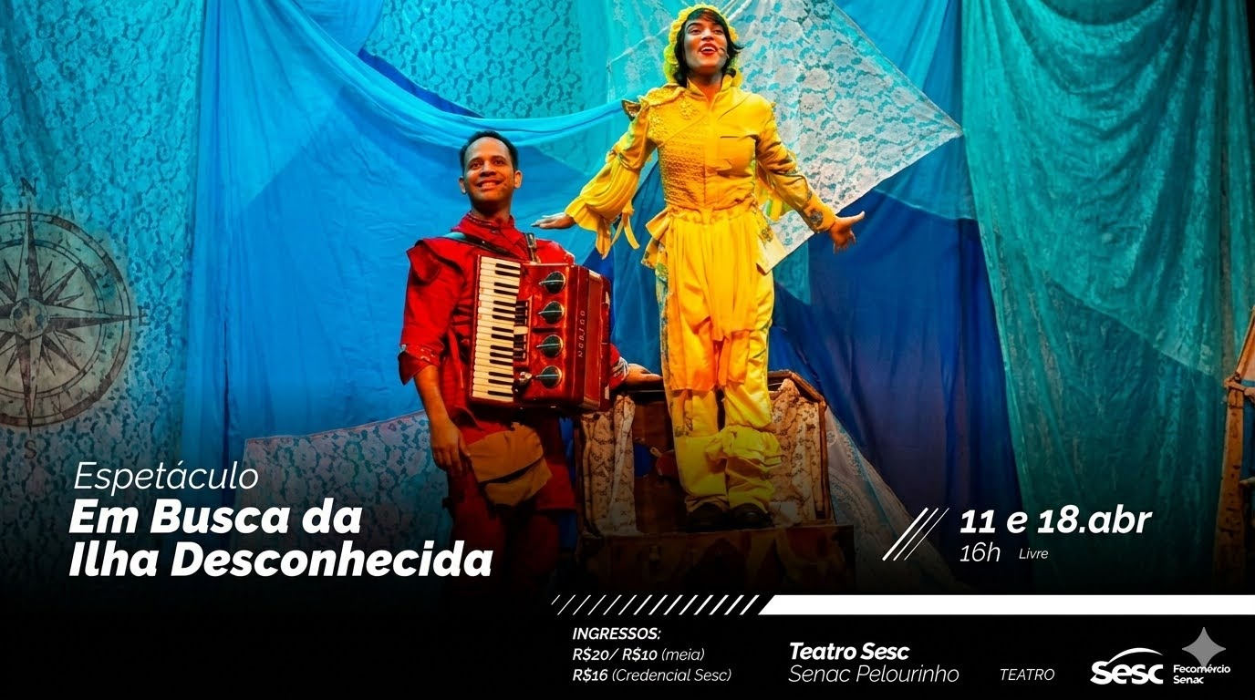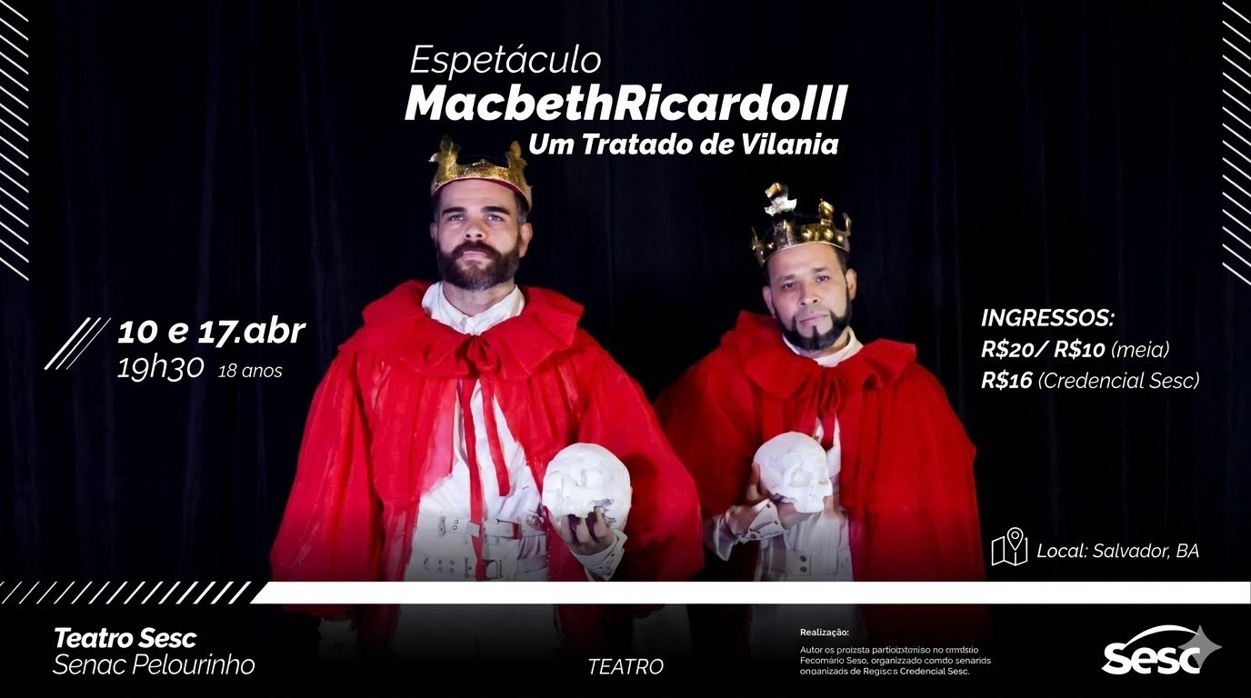 O Coletivo DUO apresenta dois espetáculos no Teatro SESC-SENAC Pelourinho em abril: o adulto "MacbethRicardoIII – Um Tratado de Vilania", nos dias 10 e 17, e o infanto-juvenil "Em Busca da Ilha Desconhecida", dias 11 e 18. Ingressos a partir de R$ 10.